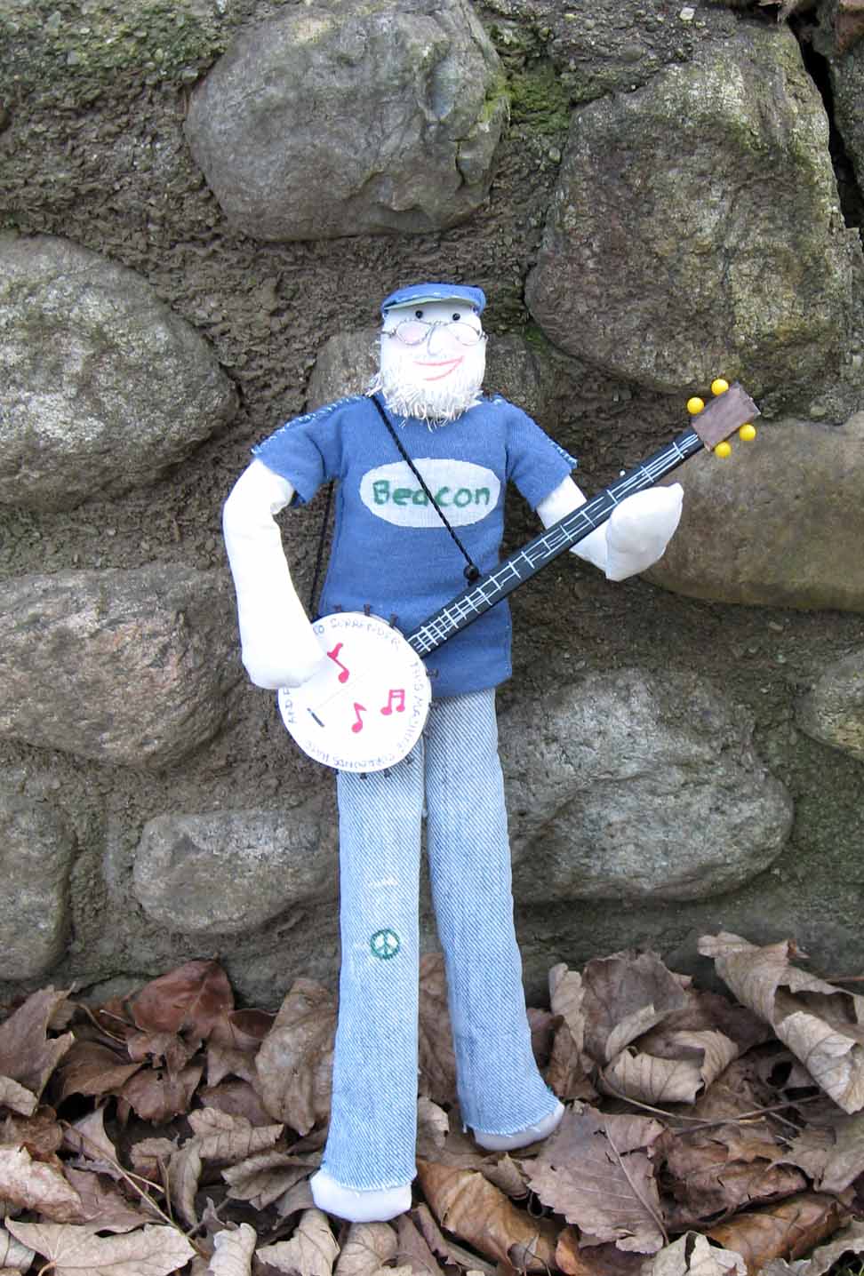 Pete Seeger is my neighbor, I am proud to say. I run into him in the post office and know I am sharing the room with a humanitarian legend. Here is an entry I submitted a few years ago to a local art event. The blank Dollar Store doll was passed out to entrants and open to interpretation. Well, I looked at those legs and knew it had to be Pete!