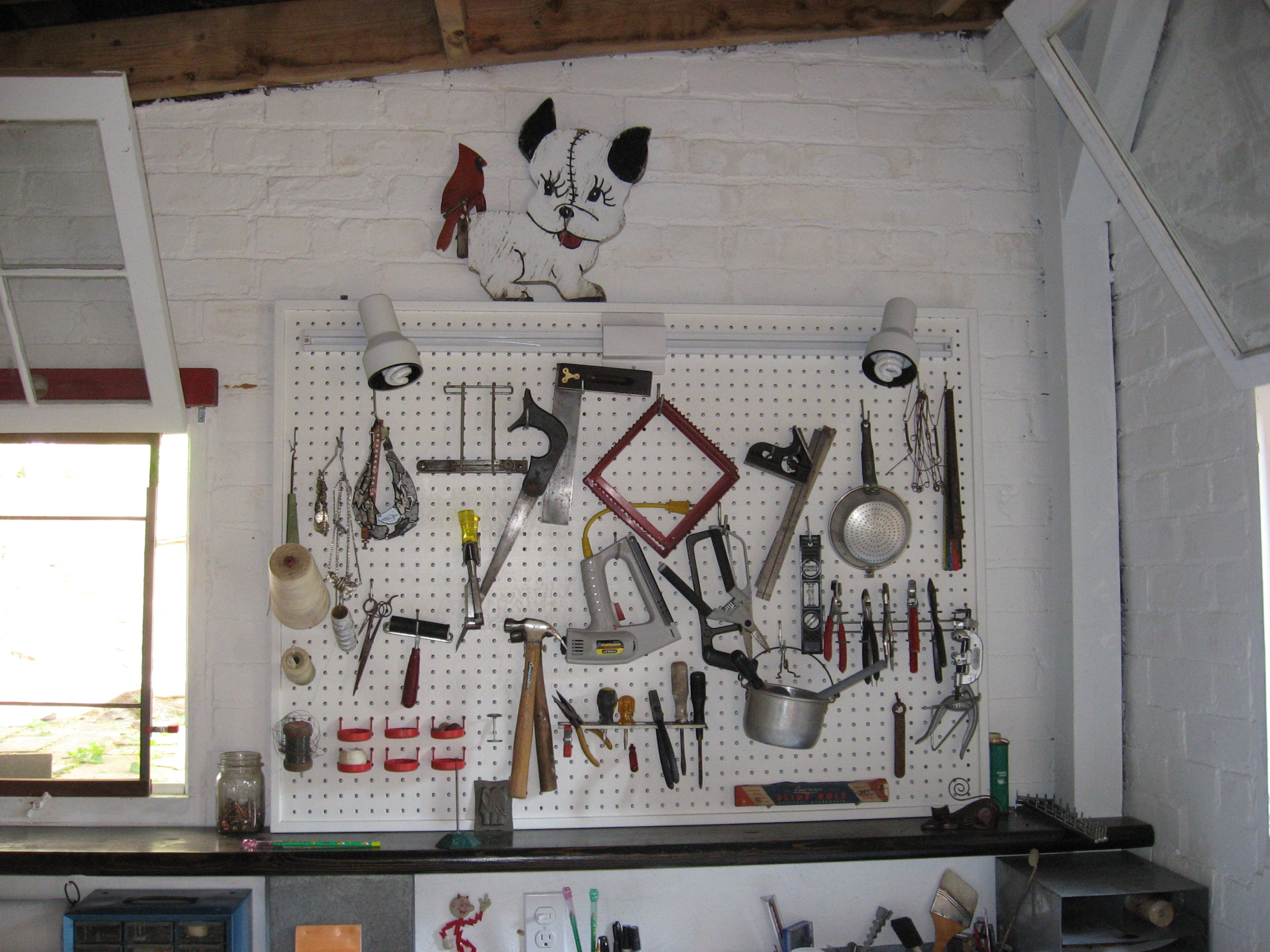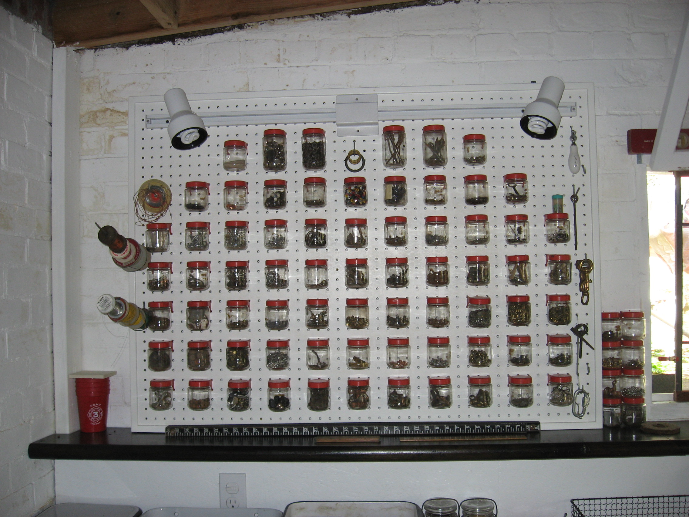 We all went into the labyrinth of the basement and discovered poems, darkroom equipment, bee notebooks, boxes of every kind of gauge, gadget, and geegaw, and, of course, the jars. I took his pegboard treasures to use in the assemblage art I was starting to do in my Brooklyn apartment. In 2000, I bought my little house upstate primarily to turn the garage into my own workshop/art studio, and continue with this calling.