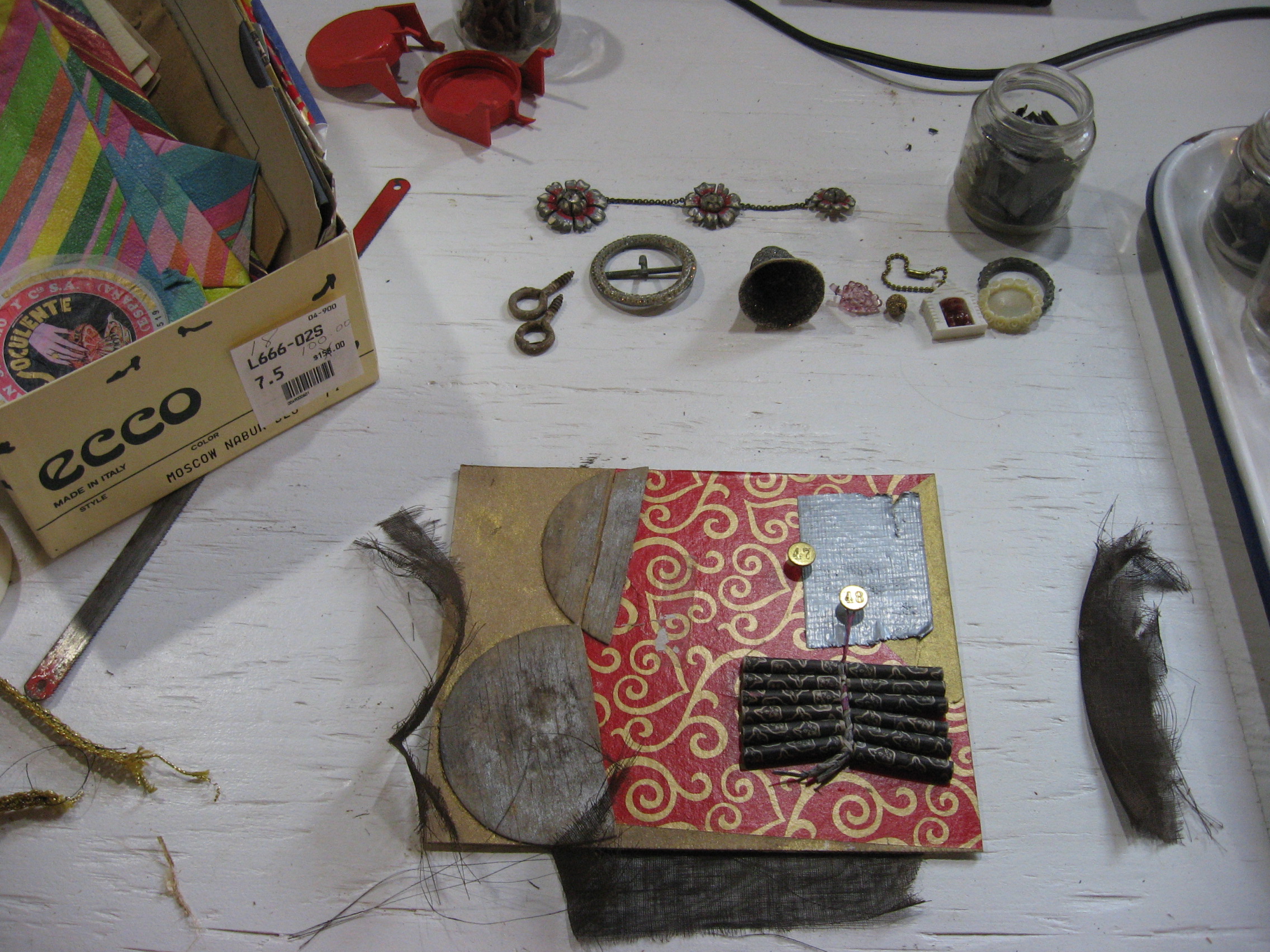 It’s cold outside! The art studio (former garage) has no heat, but before I closed the door on it until springtime I had some pieces to finish. A group show was in the wings, and so I had to kick these babies out of the nest. (Did I mention I am part magpie?) Here is some of the “before”: