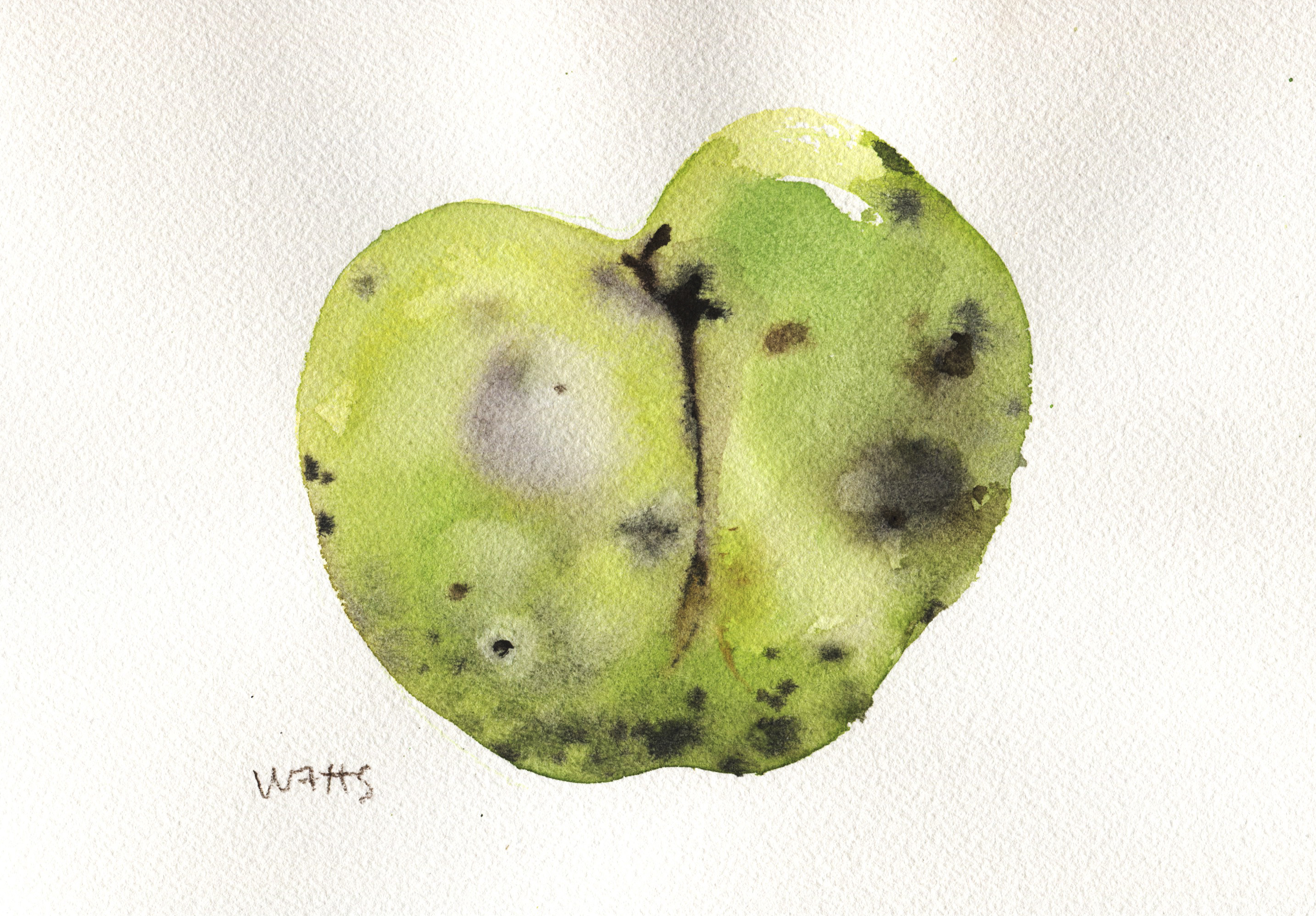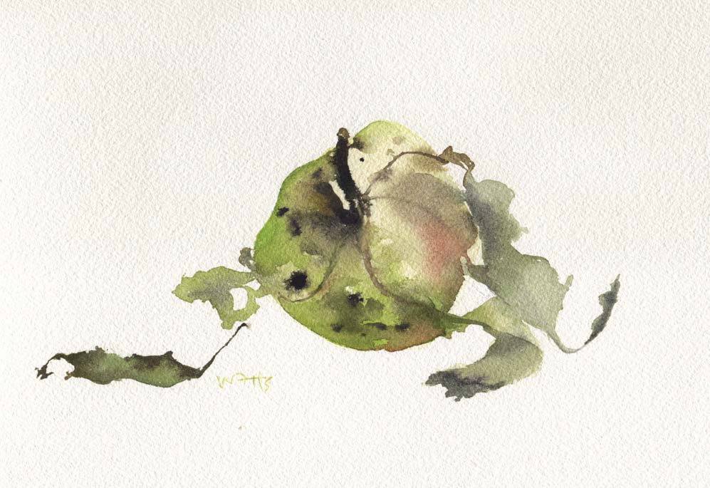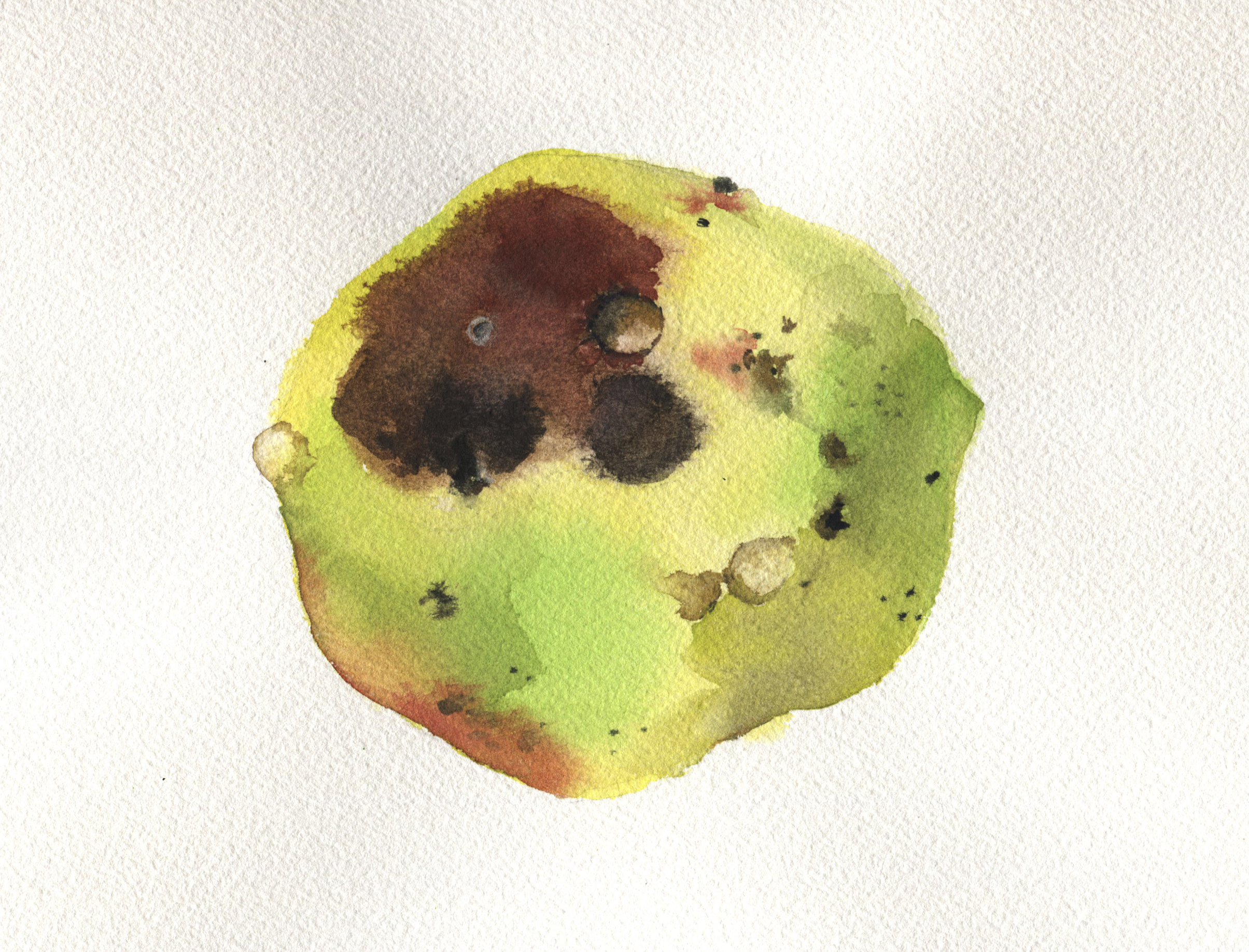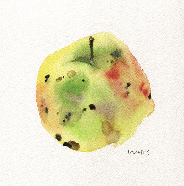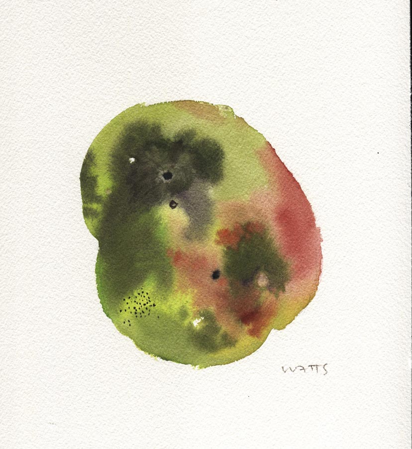 About a year or so ago, I began to paint with watercolor at the home of my friend Violet. I started with whatever was in front of me on the Formica table–usually a piece of aging fruit. Never a fan of doing still life (I like action! gesture!) I decided to view it as a challenge rather than a bore. Soon I realized that I wasn’t really painting fruit or vegetables, I was just focusing on the color, form, and detail in front of me. And such glorious detail–bruises, dings, decay! After letting the wet-on-wet color settle and dry where it wanted to (with a little help from me), I went in with a smaller brush and meditated on the beauty of imperfection. And aging. At this time in my life, the metaphor is too apt. Recently, I was helping a local landscape artist with her autumn pruning. She pointed to her apple tree and encouraged me to help myself, that they made good apple sauce. I knocked some down and thought, now I know what a real apple looks like. Each one was unique, misshapen to some aesthetics, but charming and unapologetic, and begging for a portrait. So I did, with each and every one.