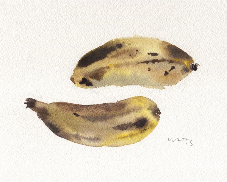 My Arches watercolor block was in my carry-on luggage, and so, dammit, I was going to paint! (I have a history of good intentions but no action when I pack art supplies). I wasn’t all that ambitious to switch brushes, but I took a few moments to paint what was around. I didn’t do the dragon fruit justice–the skin is luminous, neon, even as it aged.