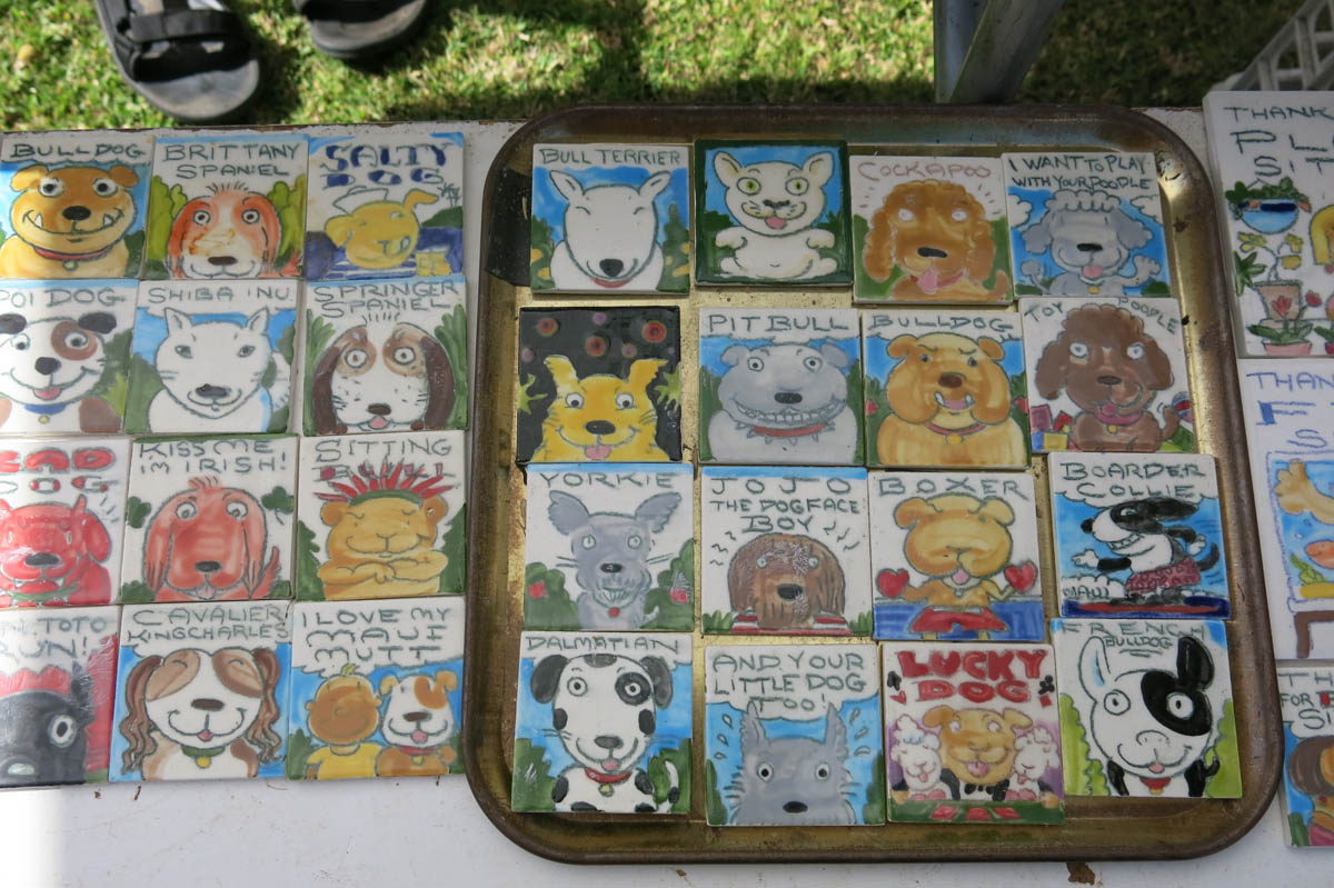 While wandering around the Maui swap meet, I saw some familiar characters drawn on tiles and magnets. Sitting there with his wares was Kimble Mead, one of my favorite illustrators from the 1970s and 1980s, whose work adorned every magazine I read in New York City at that time. He had moved to Maui, ditching those icy sidewalks and portfolio-schlepping. Kimble’s style is just as delightful as it ever was–sunny, quirky, and easily adaptable to his new home. I snapped up a few.