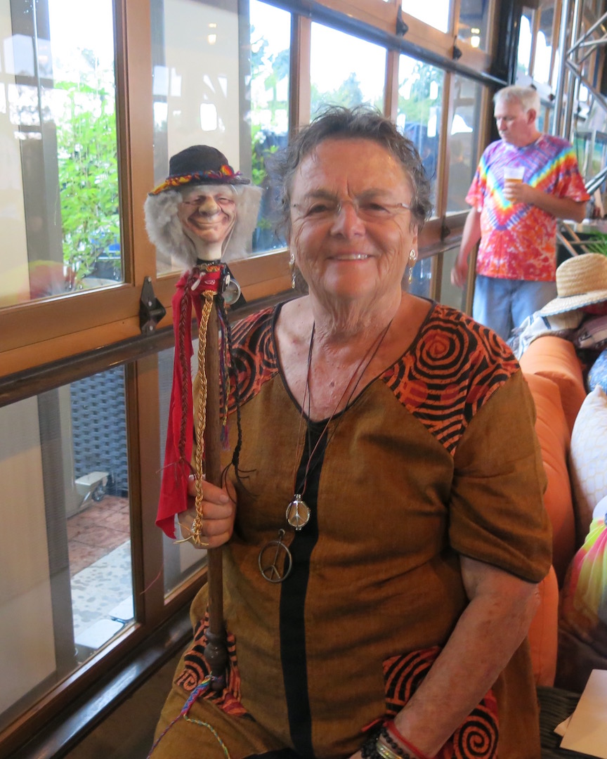 Then came the big August event—the three-day celebration on the original site of Woodstock. I was in a tent called the Writer’s Den with other authors, photographers, and filmmakers, selling product we had all created, inspired by the original phenomenon. The whole experience was naturally very different from the first time around. I watched Lisa Law, the original Hog Farm organizer who commandeered the free kitchen that fed the multitudes in 1969, approach the bar inside the “Green Room” (a V.I.P. tent that we were all ushered into when the skies opened to a torrential downpour, right on cue). I am sure the twenty-something bartender had no idea who this “old hippie” with her walking stick (“Wavy Gravy”) was, nor the irony invoked as she denied Lisa a free glass of water. Most likely she was following instructions from the manager, as well as hopping with the suddenly desirable demands of us who were not allowed in before the rains came (and who happened to now keep the tip jar overflowing).